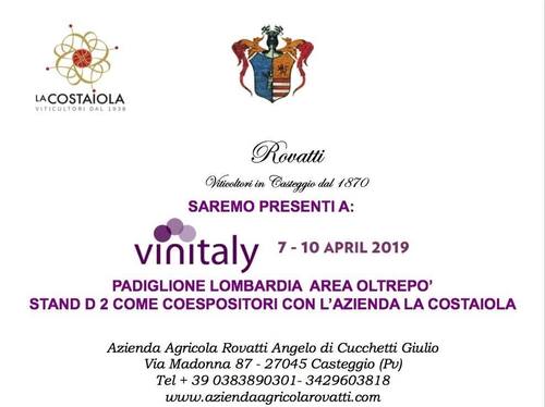 Azienda Agricola Angelo Rovatti partecipa a Vinitaly 2019 come co-espositore con la Costaiola, al padiglione Lombardia (Piano 1, Stand 2). |