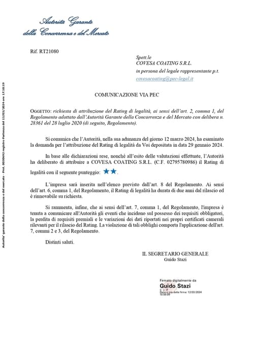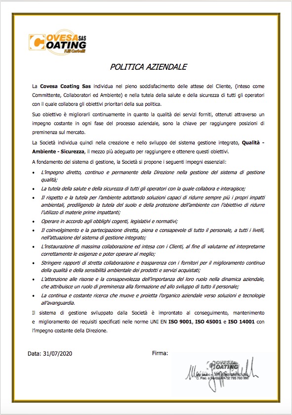 Fondata all’inizio degli anni Settanta da Abramo Corbelli, Covesa Coating è oggi guidata dall’esperienza e dalla competenza dei soci, che hanno deciso di continuare a professionalizzarsi nel campo delle verniciature anticorrosive su acciaio, carbonio ed altri metalli.